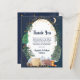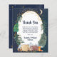 Cartões de agradecimentos rústico e econômico com chá de fraldas apresentando uma ilustração fofa de animais da floresta com suas tendas acampadas nas montanhas e na floresta, uma camada de estrelas de ouro e lua em um céu noturno e "Obrigado" e os nomes dos pais a serem em um roteiro azul escuro da meia-noite. Este cartões de agradecimentos faz parte da nossa coleção de Chás de fraldas Aventura Aguarda Animais da Floresta.