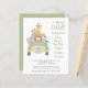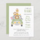 Um chá de fraldas bonitinho e acessível por e-mail, com uma ilustração de animais do zoológico bebê (leão, elefante, zebra, macaco e girafa) amontoados em um veículo de safari, "Está prestes a se tornar selvagem" em tipografia divertida, e "Chá de fraldas" e o nome da mãe na coordenação do roteiro verde do exército. Você pode personalizar facilmente o chá por email, mudar o texto "É um menino!" no veículo, e adicionar a data de vencimento na placa de licença, ou deixar o vazio.