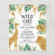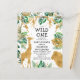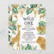 Este convite para chás de fraldas, chamado "selvagem", contém folhas falsas de ouro (girafa, leão e macacos), folhagem dourada e selva verde, e uma aspersão de confete de ouro sobre fundo branco. Adicione o nome da futura mãe e os detalhes do chá em texto preto. Um padrão de folhagem em verde e dourado em fundo branco decora a parte de trás da carta.