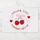 O amor é doce como cereja! Chá de noiva com cerejas amarradas em um laço rosa contra um fundo de rosa suave e cinza