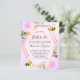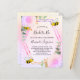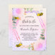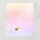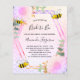Elegante, divertido, chá de panela de verão. Fundo colorido do arco-íris, cor-de-rosa, roxo e ouro, com um padrão de pente de mel. Um quadro geométrico. Decorado com flores e eucalipto verde e abelhas felizes. Com o texto: Bride to Bee o nome da noiva na frente, escrito com um moderno estilo escrito à mão. Letras negras. Volta: padrão de mel e uma abelha feliz sorrindo.