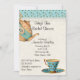 convite de festas de chá de chá de panela elegante, feito em um fundo de marfim antigo. Gráficos de uma antiguidade como o azul-céu, com um padrão de rosa-coral e borda de renda de marfim, correm pelo topo. trabalho de arte de um azul-céu, com rosas de chá de porcelana e pote de chá decoram este convite adorável. O texto preto é totalmente personalizável e pronto para personalizar o evento de festa do chá.