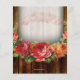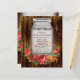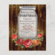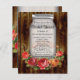 design de chá de panela com jarro de Mason e conjunto de rosas e flores coloridas em forma de coroa, numa imagem de fundo da prancha de madeira castanha escura. Um tema de verão ao ar livre rústico para um chá de panela de tema de país ou cabine. Conselhos de madeira marrom-escura, ricos em madeira, provenientes de uma vedação antiga ou de painéis de flutuação, contrastam com o belo gráfico floral bonito. © CustomInvitesOnline.com