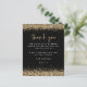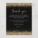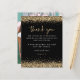 Dourado Chá de panela De Fotografia De Script Glitter Preto Obrigado. Um alternativo de 4,5 pol x 5,6 pol com preço inferior. Disponível em um STOCK DE CARTÃO SEMI-GLOSS 110 lb, que é a opção padrão (mais espesso para convites), OU um STOCK de PAPEL THINNER FINISH 80 lb FINISH (ideal para gabinetes). Os envelopes são um extra opcional e são ligeiramente maiores que o tamanho da placa. As bordas da falsa brilha do ouro estão no topo e no fundo na frente, e Obrigado está em um script de escrita manual definido na coordenação do ouro. Personalize facilmente o resto do texto. No verso, substitua a foto da amostra por sua favorita no seu evento. Você também pode alterar as cores do texto e do plano de fundo por meio da opção personalizar mais, se desejar.