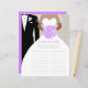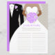 Um noivo gráfico elegante com tux e noiva com véu segurando uma postura de rosas roxos estilizados de chá de panela floral. Edite este jogo de chá de panela divertido com o nome da noiva e do noivo. Os convidados de chás de panela são convidados a criar tantas palavras quanto possível do nome da noiva e do noivo e preencher as palavras que criam nas linhas fornecidas. Um jogo fácil que é bom para usar como um quebra-gelo. Design e arte gráfica únicas por Sarah Trett para www.mylittleeden.com