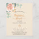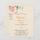 Um fundo cor bege. Decorados com ouro-rosa e folhas de eucalipto cor-de-rosa-esbranquiçada, flores de rosa e cor-de-rosa-esbranquiçada, galhos, verde-verde e um cinzeiro de ouro falso. Personalize e adicione o nome da noiva a ser e os detalhes da festa. Letras pretas e ouros coloridas. 1 folha = 1 convite impresso de borda a borda.