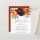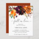 Chá de panela de orçamento russo com o cabeçalho "Fall in Love" junto com um buquê floral de cor d'água com tons quentes e úmidos de laranja queimada, terracota e burgundy profunda junto com algum verde. Um design elegante com os ricos tons do outono perfeito para um chá de panela de outono. Esses convites de chá de panela baratos são impressos em folhas de papel para uma opção econômica.