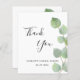 Um cartões de agradecimentos para um Chá de panela. Um fundo branco chico decorado com verde de eucalipto. Na frente, um grande script de cor preta, escrito à mão, e o texto: Obrigado, seu e uma data. Voltar: Personalize e adicione seu nome e nota de agradecimento.