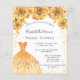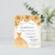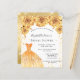 Um convite moderno, na moda e glamouroso para um Chá de panela, brunch. Um fundo branco com poeira brilhante de ouro falso, um vestido e rosas, florais. O nome é escrito com um moderno estilo escrito à mão. Personalize e adicione os detalhes da sua festa. Fundo: fundo dourado falso com faíscas.