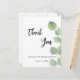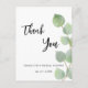 Um cartões de agradecimentos para um Chá de panela. Um fundo branco chico decorado com verde de eucalipto. Na frente, um grande script de cor preta, escrito à mão, e o texto: Obrigado, seu e uma data. Voltar: Personalize e adicione seu nome e nota de agradecimento.