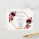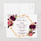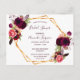 Um Chá de panela de estilo boho. Na frente: Um fundo branco com um quadro fino em forma geométrica dourada. Decorados com flores, rosas e penas do estilo "boho" escuras e burguesas. Modelos para o nome da noiva e detalhes da festa. O nome é escrito com um estilo escrito à mão, letras coloridas e brilhantes.