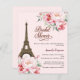 Um convite moderno, na moda e glamouroso para um tema chá de panela e parisiense. Um fundo cor-de-rosa suave, a torre Eiffel de Paris com rosas cor-de-rosa, flores. O nome é escrito com um moderno estilo escrito à mão. Personalize e adicione um nome e detalhes da parte. 1 folha = 1 convite de borda a borda.