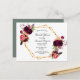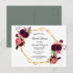 Na frente: um fundo branco elegante com uma estrutura geométrica dourada falsa. Decorados com flores, rosas e penas do estilo "boho" escuras e burguesas. Modelos para o nome da noiva e detalhes da festa. O nome é escrito com um script de estilo manuscrito, letras pretas. Volta: um cenário verde de sábio. Dica: Se você não quiser que pareça um cartão postal, clique em personalizar, vá para o verso e remova o divisor e o carimbo de posto.