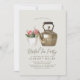 Este elegante convite de festas de chá de chá de panela inspirado em vintage tem sotaques antigos, ouro/latão, rosa e branco. O convite inclui um teacup em peônias de aquarelas, uma chaleira de ouro/latão/pote de chá e design de peônias de aquarela na parte traseira do cartão. Ele também apresenta uma elegante tipografia de design e tipografia de vintage mostrando o nome da noiva a ser.