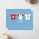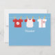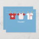 O chá de fraldas do tema baseball agradece aos cartões de anotação que tem três lindas roupas de beisebol para bebês pendurados em uma linha de roupa com o texto "Obrigados!". Uma paleta colorida de vermelho e branco sobre um fundo azul com o espaço azul para sua mensagem manuscrita.