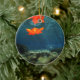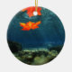Uma folha laranja brilhante afundando debaixo de um ripo, com raios de luz solar caindo pelas águas até as rochas no leito do ribeiro.