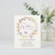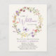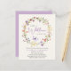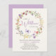 Um convite para chá, amigável e elegante, para bebês-creme claro, com "uma pequena flor selvagem está a caminho" numa mistura de tipografia moderna de cinzas moles e uma escrita púrpura de lavanda na moda, e aquarelas caprichosas inspiradas no véu de uma coroa de flores roxas, cor-de-rosa, pêssego e amareladas e uma borboleta roxa. Personalize o nome da mãe e os detalhes do chá em lavanda simples e tipografia de cinza.