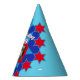 Um padrão de estrela brilhante adiciona sua própria foto e um chapéu de festas. Ideal para uma festa especial de 70. Design de padrão colorido de estrelas vermelho e azul. A cor de fundo também pode ser alterada para sua própria escolha, atualmente azul claro. Arte original e design por Sarah Trett. www.sarahtrett.com para www.mylittleeden.com