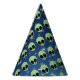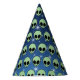 Um padrão de cabeça alienígena verde com olhos ovais grandes e pretos e um pequeno pedaço preto para a boca. O fundo é uma cor de gradiente azul-escuro a claro, pontilhado com estrelas brancas.