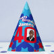 Foto personalizada personalizada personalizada com padrão brilhante e chapéu de festa de aniversário de nome. Ideal para uma festa especial de aniversário de 40 anos de meninos. Design de estrela colorida vermelha e azul. A cor de fundo também pode ser alterada para sua própria escolha, atualmente azul claro. Arte original e design por Sarah Trett. www.sarahtrett.com para www.mylittleeden.com
