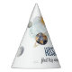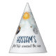 Celebre o marco especial do seu filho com estes chapéus de festas mágicas do espaço exterior. Apresentando planetas imaginários, luas e estrelas em marinho e mira dourada. Esses chapéus de festas de galáxias solares e planetas são perfeitos para uma simples festa de aniversário. O moderno design whimsical mostra um fundo de marinho-azul-aquarela adornado com um sol vibrante amarelo, lua de cinza sorridente, planetas de cor pastel e estrelas de brilho dourado dispersas.