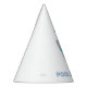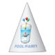 Chapéu de festa com uma ilustração fofa de uma baleia. A baleia está vestindo um chapéu de festas listradas vermelho e branco e começou a festa de aniversário que acontece em um copo d'água cheio.