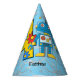 Um robô azul e amarelo bonito em um fundo do circuito de computador. Grande chapéu da festa de aniversário para a criança de quatro anos!