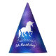 Chapéus roxos do partido do papel do aniversário das meninas da silhueta do unicórnio da folha do falso. A silhueta branca bonito de um unicórnio no falso foil o fundo roxo e azul. Personalizado com nome das meninas do aniversário na pia batismal branca e na sua idade. Fontes do partido do unicórnio do divertimento para um aniversário temático do unicórnio. www.SamAnnDesigns.com