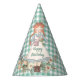 Esta festa que mostra uma cena aquosa de Anne of Green Gables vestindo um vestido azul com um avental branco. No avental diz-se "Parabéns". Este texto pode ser personalizado se quiserem. O fundo é um padrão de verificação de gingham verde e branco. O chapéu perfeito para qualquer fã de Anne of Green Gables.
