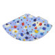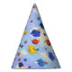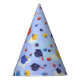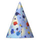 Esses chapéus de festa de formatura são decorados com uma cena de bonés de formatura coloridos jogados no ar, mostrados contra um céu azul com nuvens finas.
