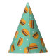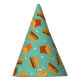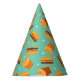 Os cheeseburgers de estilo retrô e o padrão das batatas fritas com pequenos corações brancos num chapéu azul de fundo.