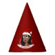 Chapéu de festa com uma ilustração da linda jovem africana-americana com cabelo ondulado e chapéu de Papai Noel; com modelo de texto editável, design de férias de Natal com fundo vermelho
