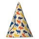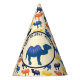 Comemore aniversários e outros eventos especiais em estilo com esses chapéus de festas de papel com uma ilustração em estilo cartoon de um camelo de bactriano ou de um camelo com dois corcundas em azul médio contra um deserto e fundo colorido com sua própria mensagem personalizada e um padrão completo de camelos em tons de azul, laranja e amarelo.