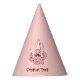 Cartoon de chef rosa com bigode segurando faca e garfo de cozinhar. Cor de fundo personalizada. Texto personalizado.