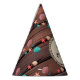 Celebrate in coastal cowgirl style with this rustic wood birthday party hat. The design features a warm wooden background scattered with seashells, starfish, and horseshoes, creating a unique blend of western charm and beach-inspired details.