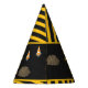 Celebrate your little one's special day with this custom boy paper party hat with an adorable construction theme. The hat has a dump truck and excavator working together at a road construction site. There are also orange traffic cones, a safety divider, and yellow and black stripes. Add your child's name and age for a special touch!