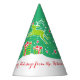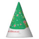 Um bonitinho chapéu de festa personalizado de renas balneares sazonais de inverno. Perfeito em tons festivos de verde, vermelho e branco. © Imagem exclusiva de rena galente saltando sobre presentes desenho original e design gráfico por Sarah Trett www.sarahtrett.com para www.mylittleeden.com no zazzle.