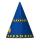 Legal chapéu de festa de aniversário de construção personalizado para uma criança que ama veículos de construção amarelos em um fundo azul. Festa de carro divertida a favor de um garotinho que amará carros e caminhões. Personalize com o nome do seu filho sob a fita de precaução preto e amarelo.