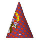 Um cachorro fofo com um arco rosa e bolinhas roxas com orelhas grandes e castanhas de disquete e olhos grandes e uma cauda alagada e cachorros menores no fundo com arcos vermelhos e um fundo cardíaco vermelho faz parte desses chapéus divertidos de festas de papel. Personalizável para que você possa adicionar seu próprio texto e alterar a cor de fundo. Diga Feliz Aniversário com este design adorável! Vai excelente com as nossas placas de papel e xícaras de papel correspondentes.