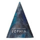 Este chapéu de festas de espaço, personalizado com o texto de sua escolha, irá agradar aos seus convidados. Arte de fundo é uma galáxia aquarela com estrelas e planetas. Parte de uma coleção da Parcel Studios.