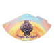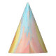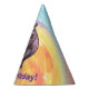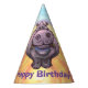 Parada Animal Hippopotamus Party Hat mostra nosso lindo hipopótamo da frente em um fundo amarelo, laranja, azul e rosa texturizado com as palavras Feliz Aniversário ao longo do fundo. Comemore o aniversário do seu filho em lindos animais selvagens com nossos suprimentos de festa coordenados do hipopótamo, presentes, decorações, favoritos para festas e muito mais. Este adorável hipopótamo traz sorrisos. Festa!