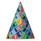 Crianças Personalizadas O Padrão De Monstro Feliz Festa De Aniversário Adiciona Chapéu De Papel Idoso. Rostos de monstro coloridos com um e dois olhos num padrão quadrado de cor brilhante. Quadrados vermelhos, laranja, amarelos, verdes, azuis e roxos em padrão repetido. Adicione nome e idade em um círculo branco. Material de festa de monstro divertido.