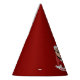 Um chapéu de festa com uma ilustração de uma menina feliz sorridente com cabelo preto curto, ela está vestindo fantasia de Papai Noel vermelho e branco e segurando um presente; com um modelo de texto editável para seu nome ou mensagem, design de Natal com fundo vermelho