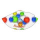 Feliz aniversário. O texto é escrito em laranja com uma sombra preta. A imagem de fundo é uma representação gráfica de várias bolhas em diferentes tamanhos e cores (azul, verde, branco, amarelo, vermelho, laranja).