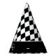 This party hat is shown in a black and white color harlequin diamond pattern with a Happy Halloween print.