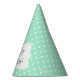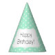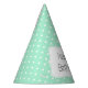 Chapéus de papel de festa de aniversário de massa mágica e padrão de bolinhas branca. O design apresenta um padrão de bolinhas branca em verde-menta e uma forma branca no meio com o seu texto personalizado.