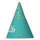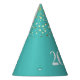 This party hat is shown in a turquoise color with a print of fun Golden petite stars on it.