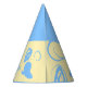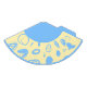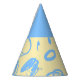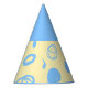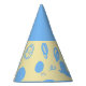 Esta festa de papel que apresenta um design divertido baseado em linhas circulares, pontos artísticos e bolinhas planas em azul claro sobre um fundo branco amarelado. A parte superior é da mesma cor do impressão.