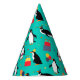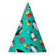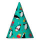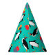 Parte da coleção do partido do pinguim, pinguins do divertimento que comemoram uma festa de aniversário, fundo de turquesa.
