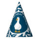 Tire a festa de aniversário do pato ou evento especial em estilo com este chapéu de festa divertida. Esses chapéus apresentam um padrão de penas de pato branco contra um fundo azul marinho com uma ilustração de um pato branco na frente e sua própria mensagem personalizada.